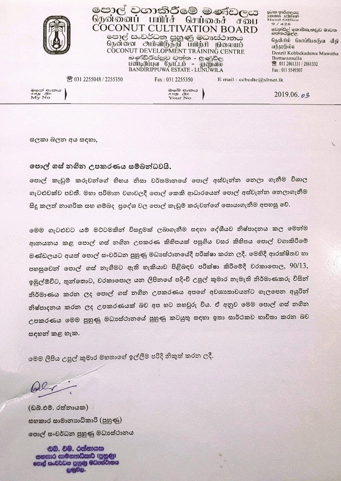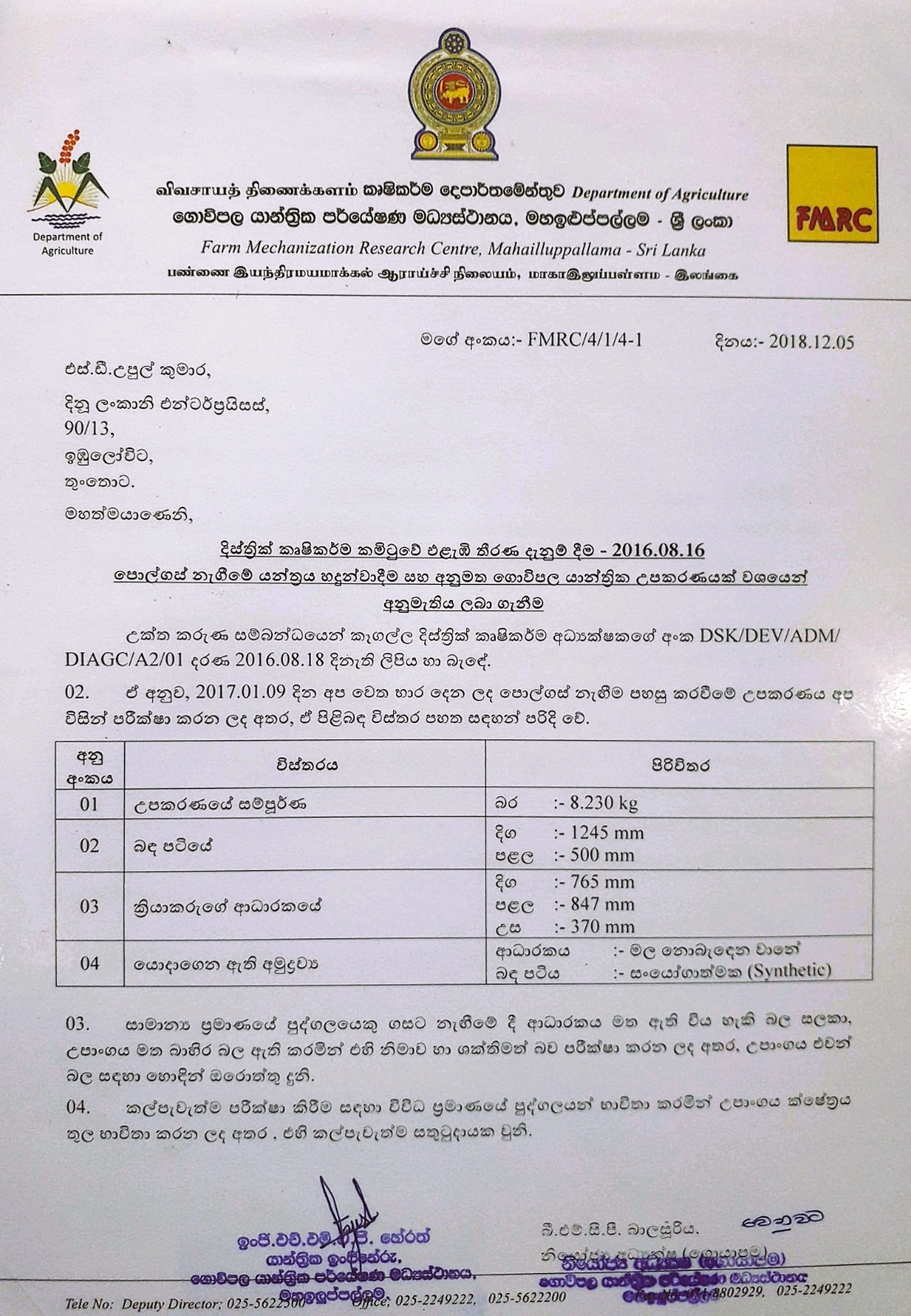 FMRC (කෘෂි උපකරණ පර්යේෂණ හා සංවර්ධන මධ්යස්ථානය) සහ CDTC (පොල් සංවර්ධන පුහුණු මධ්යස්ථානය) මගින් වසර 3 කට ආසන්න කාලයක් පොල් ගස් 500 ක පමණ නැග පරීක්ෂා කර ආරක්ෂාව සහ කල්පැවැත්ම සහතික කළ, වසර 5 ක අසමසම වගකීමක් සහිත ශ්රී ලංකාවේ එකම සුදු යකඩින් නිෂ්පාදිත පොල් ගස් නැගිය හැකි උපකරණ කට්ටලය දැන් ඔබට නිවසටම ගෙන්වා ගත හැක.
